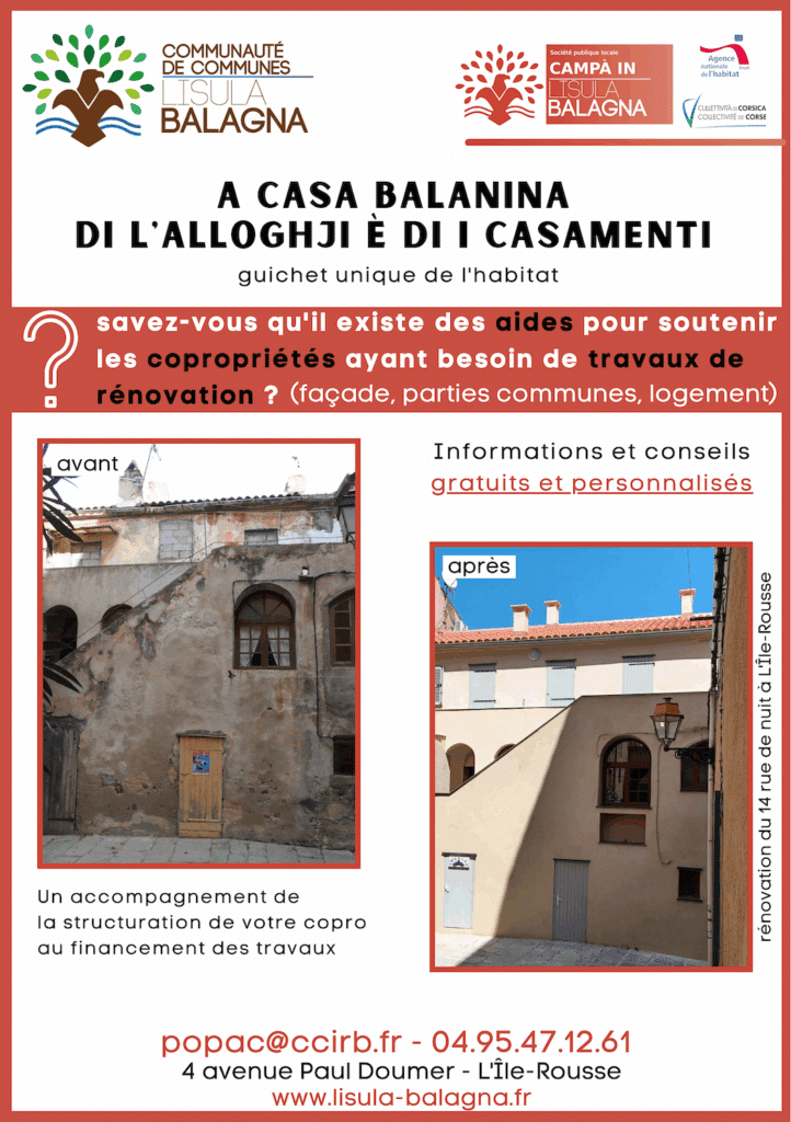Signé en 2022 entre la CCIRB, l’ANAH (Agence nationale de l’habitat) et la Collectivité de Corse, ce programme s’étend jusqu’en 2027. Il combine aides financières et accompagnement technique pour améliorer la qualité du parc immobilier privé et répondre aux besoins des habitants.